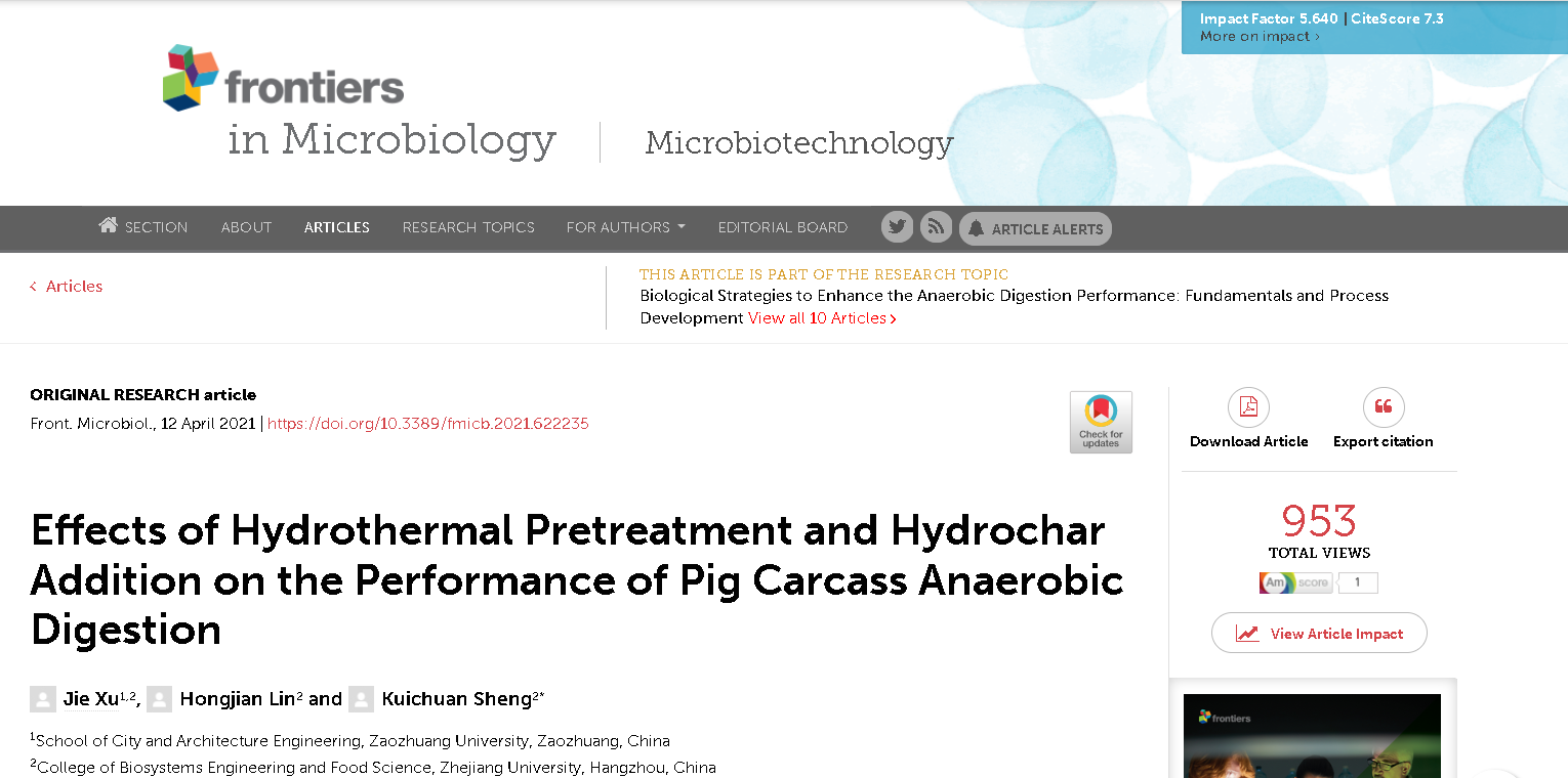 近日,伟德国际1946源于英国固废资源化综合利用科研小组在水热炭调控厌氧消化研究方面取得最新进展,相关工作发表在国际著名期刊《Frontiers in Microbiology》(中科院一区,TOP期刊,影响因子5.640)上,论文题目为《Effects of hydrothermal pretreatment and hydrochar addition on the performance of pig carcass anaerobic digestion》,枣庄学院为第一单位,徐杰博士为论文第一作者。