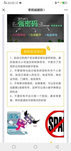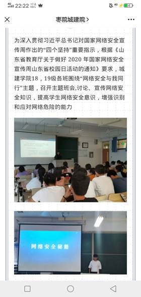 网络安全宣传周活动期间,学院积极开展线上、线下相关活动,不断强化主题宣传教育。9月16日,学院组织各班级开展了“网络安全与我同行”主题班会,通过学习相关材料,同学们了学习到了更多有关网络安全方面的内容。通过班会的学习、讨论之后,各班组织了同学们参加全民网络安全知识竞赛,激发同学们学习网络安全知识的兴趣,提升网络安全防护技能,增强安全防范意识,提高识别和应对网络危险的能力。通过学院官方微信、网站等新媒体推送网络安全知识,引导学院师生正确使用网络,提高网络道德观和法制观。多种形式广泛宣传个人网络信息保护、电信诈骗、网络暴力、网络法律维权等安全知识。